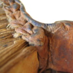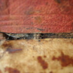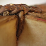 表紙裏です。芯材を糸で結合しています。見返しの羊皮紙も破れ部を縫ってあります。