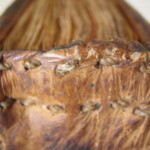 本体の綴じつけも左図のようにペアになったリンクステッチで縫ったように2本の糸が綴じ部に見ることができます。(最初の綴じ部は3本になっています)